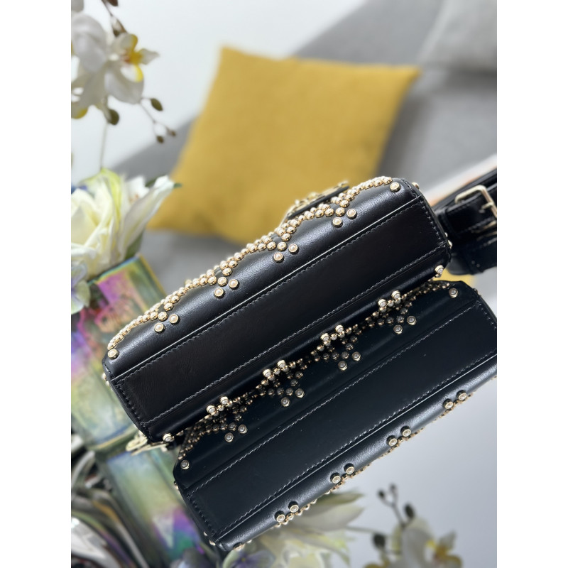 DetailFeaturing tonal mini beadwork in lattice patterns, showcasing Dior's exquisite craftsmanship. Accented with light gold-tone metal D.I.O.R. charms for an elegant silhouette. This compact design includes a detachable chain shoulder strap and adjustable leather strap, ideal for everyday versatility.