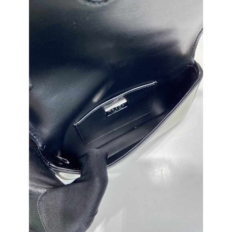 Can be worn around the neck Iconic angled sides create a minimalist silhouette that sits flat against the body. Shiny leather body, detachable adjustable leather shoulder strap, magnetic flap closure, logo print Re-Nylon lining.