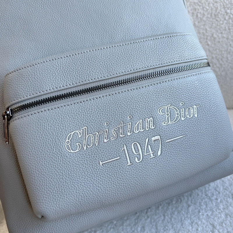 The silhouette is simple and the classic preppy style exudes vibrancy. Crafted from gray grained calfskin, it features an embroidered '1947' signature. With details like two-way zip closure, front zip pocket and adjustable padded shoulder straps, it's ideal for everyday styling.
