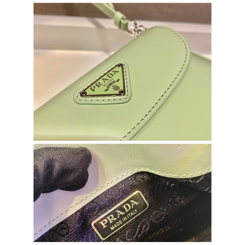 DetailThe special beveled structure of the bottom and sides of this flap bag emphasizes the smooth curved lines and gives it a sophisticated appeal, while the extended handles make it even more functional, allowing it to be worn as a shoulder bag or a tote. Brushed leather, unique to the Prada collection, is a modern, color-changing material perfect for new combinations and contrasts. A triangular enameled logo completes the silhouette.