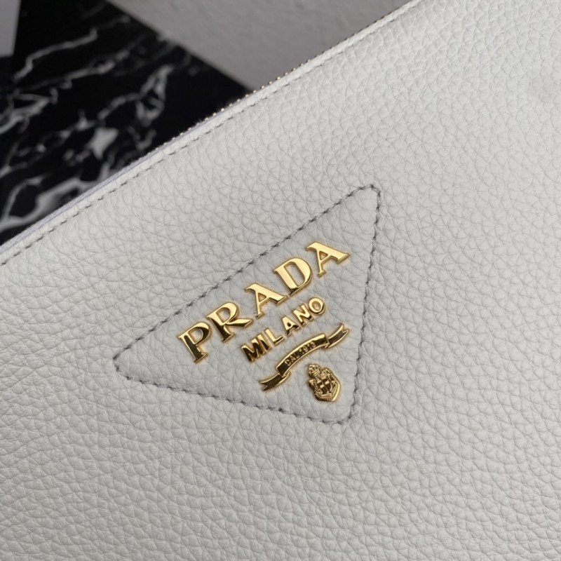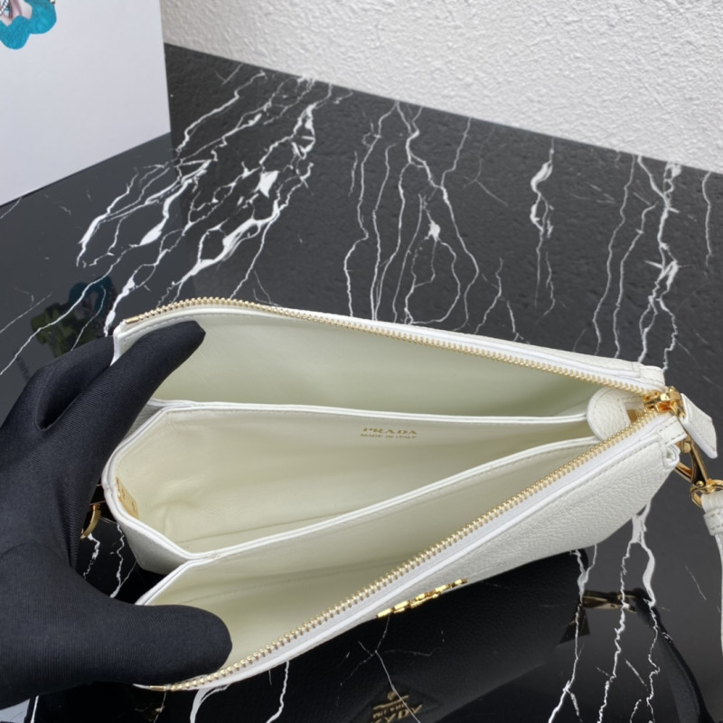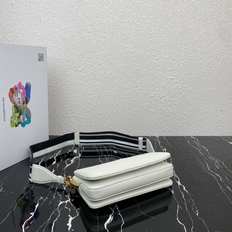 DetailCrafted from supple leather, this compact shoulder bag embodies the House's mastery of craftsmanship and features a new interpretation of the triangular logo, with topstitching and Prada's metallic monogrammed logo shimmering in the center. With three compartments and a detachable, adjustable shoulder strap emblazoned with a beautifully embroidered logo, this bag is masterfully crafted to express a feminine image.