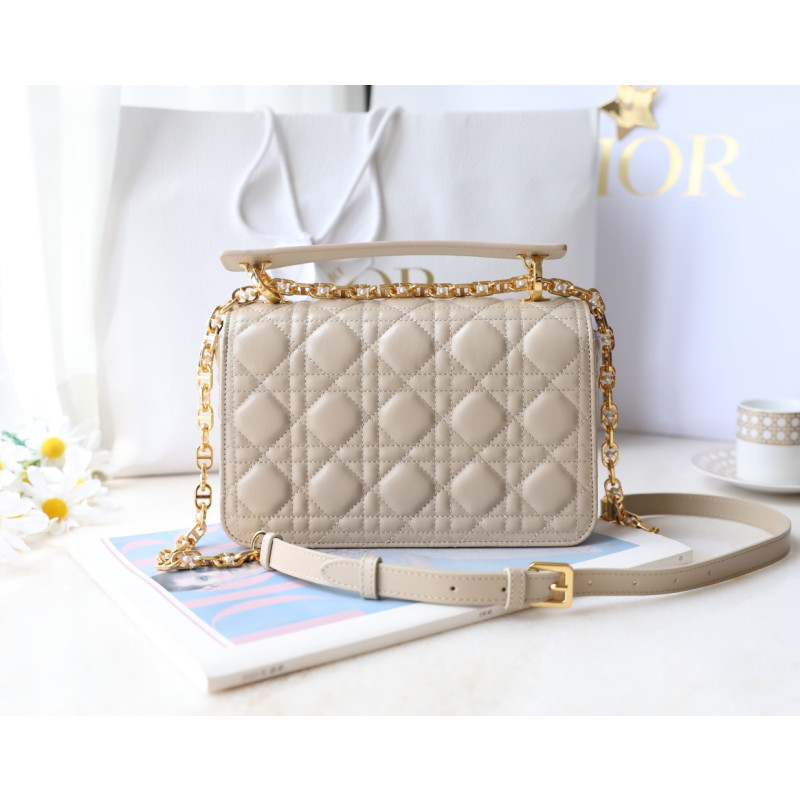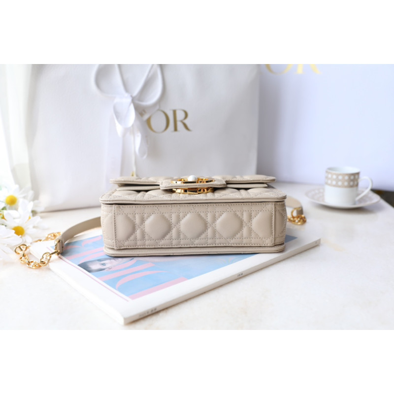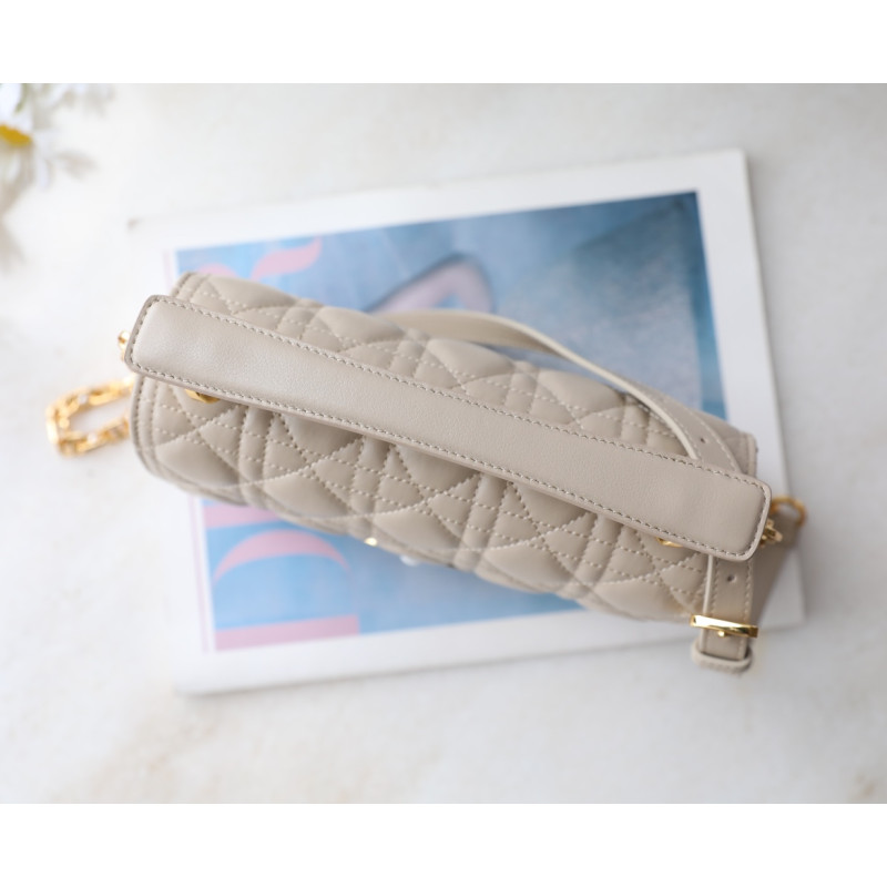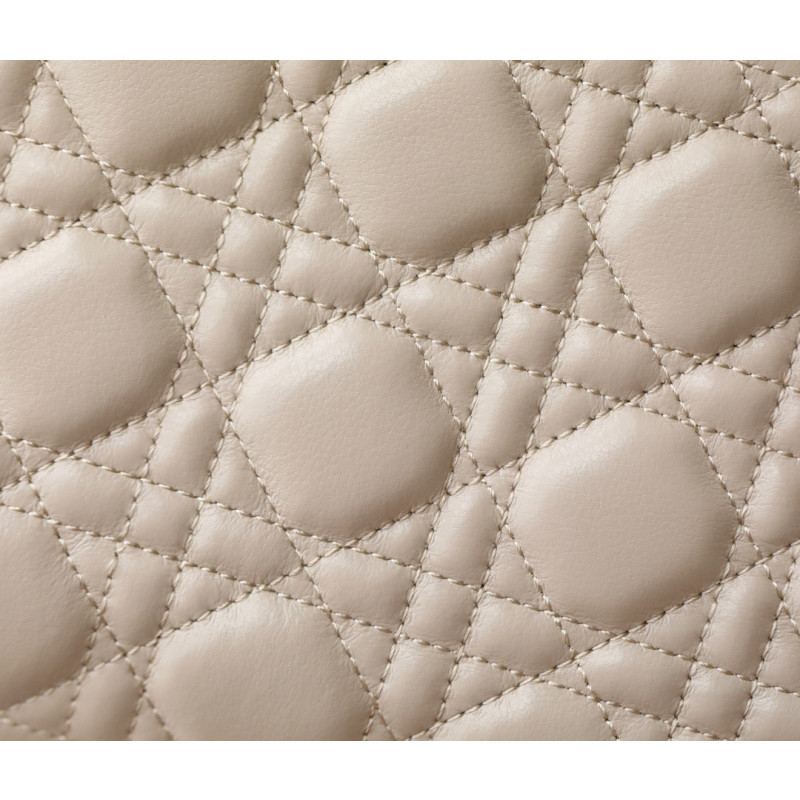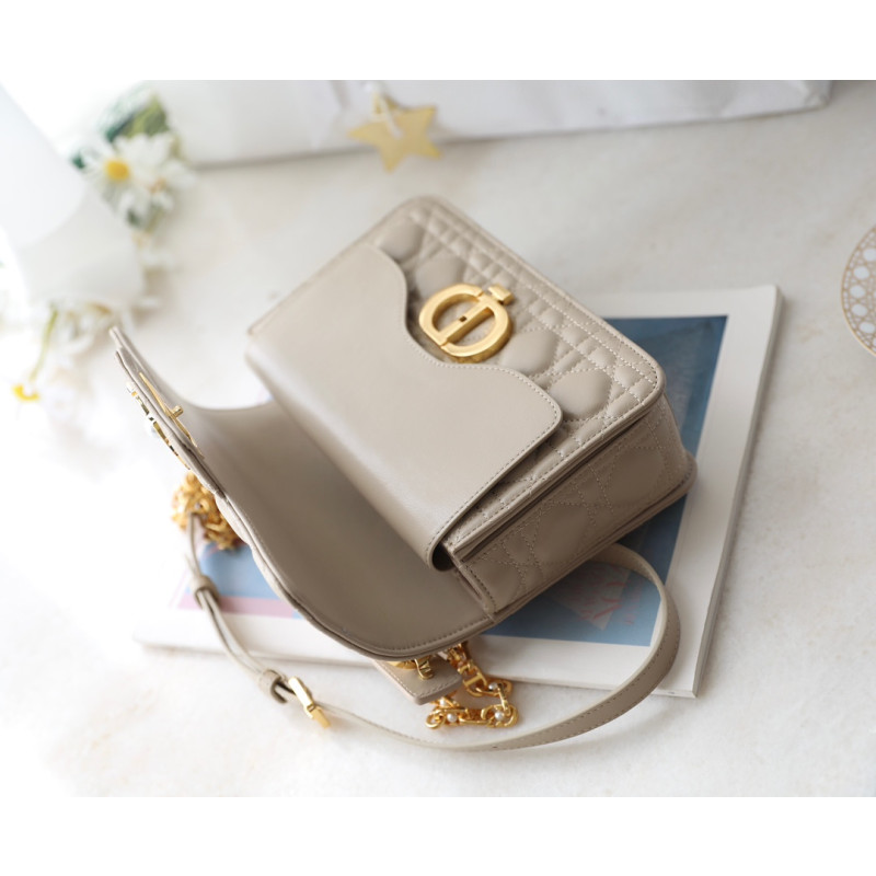 Made from white cowhide leather with lattice-pattern stitching and a double flap adorned with the CD logo, complemented by white resin beads. It features three compartments and a zip pocket for everyday essentials, ideal for both casual and evening outfits.