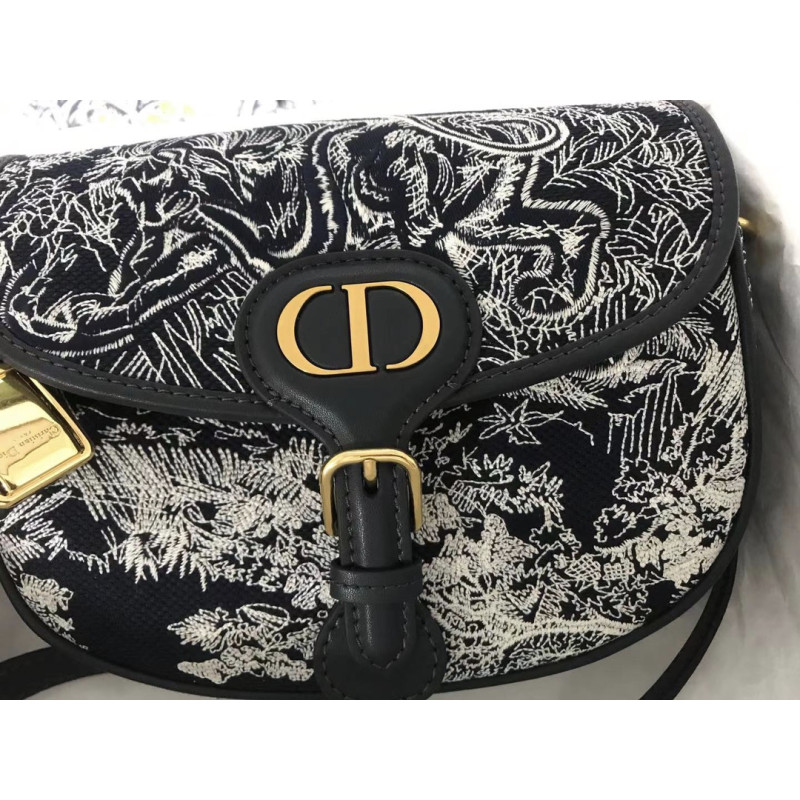 Embroidered Toile de Jouy motif and finished with antique gold-tone hardware. The detachable, adjustable shoulder strap with military buckle fits in the hand, over the shoulder or across the body.