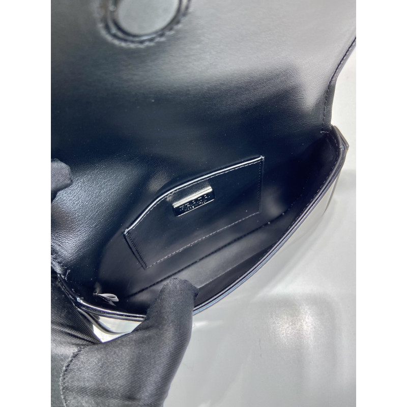 Can be worn around the neck Iconic angled sides create a minimalist silhouette that sits flat against the body. Shiny leather body, detachable adjustable leather shoulder strap, magnetic flap closure, logo print Re-Nylon lining.